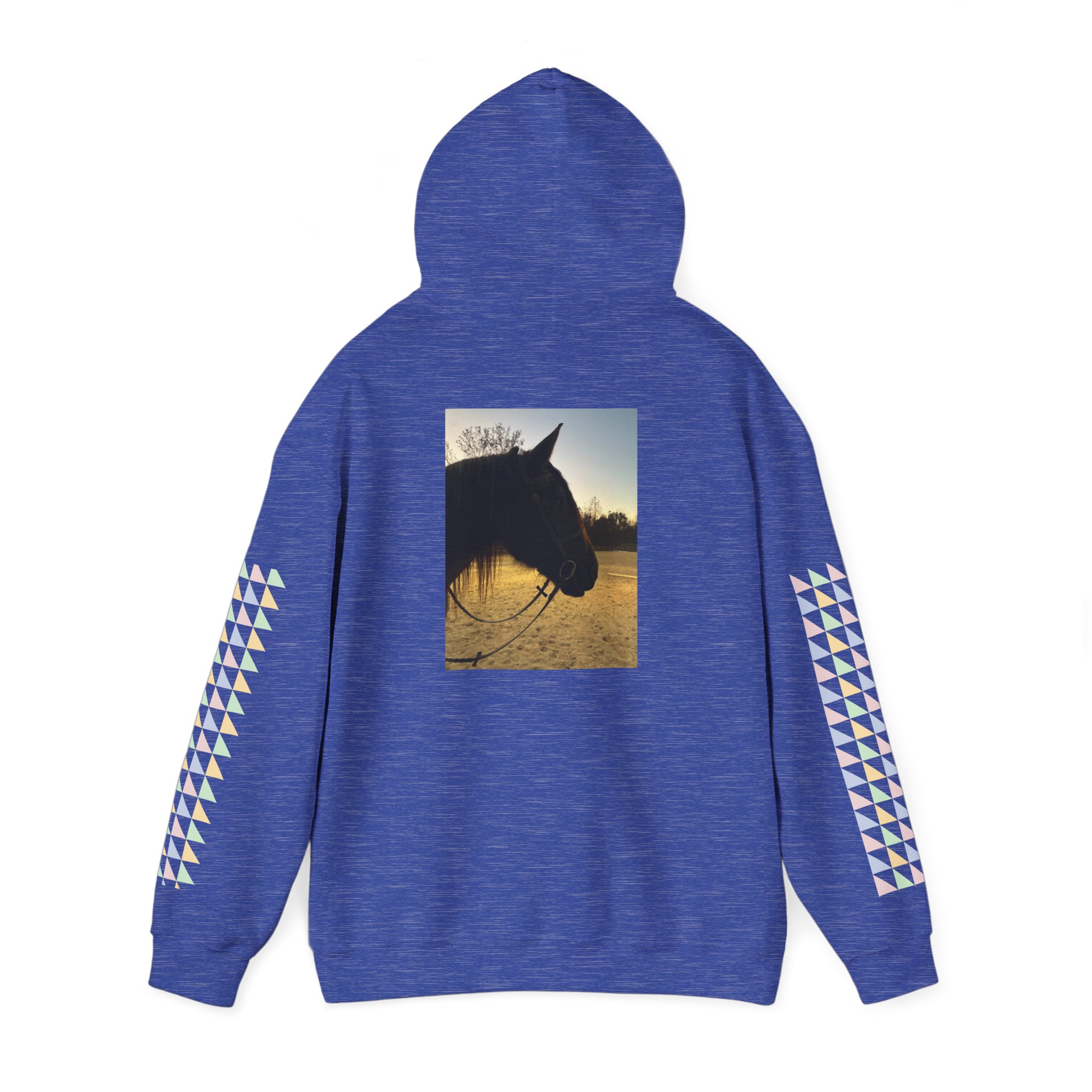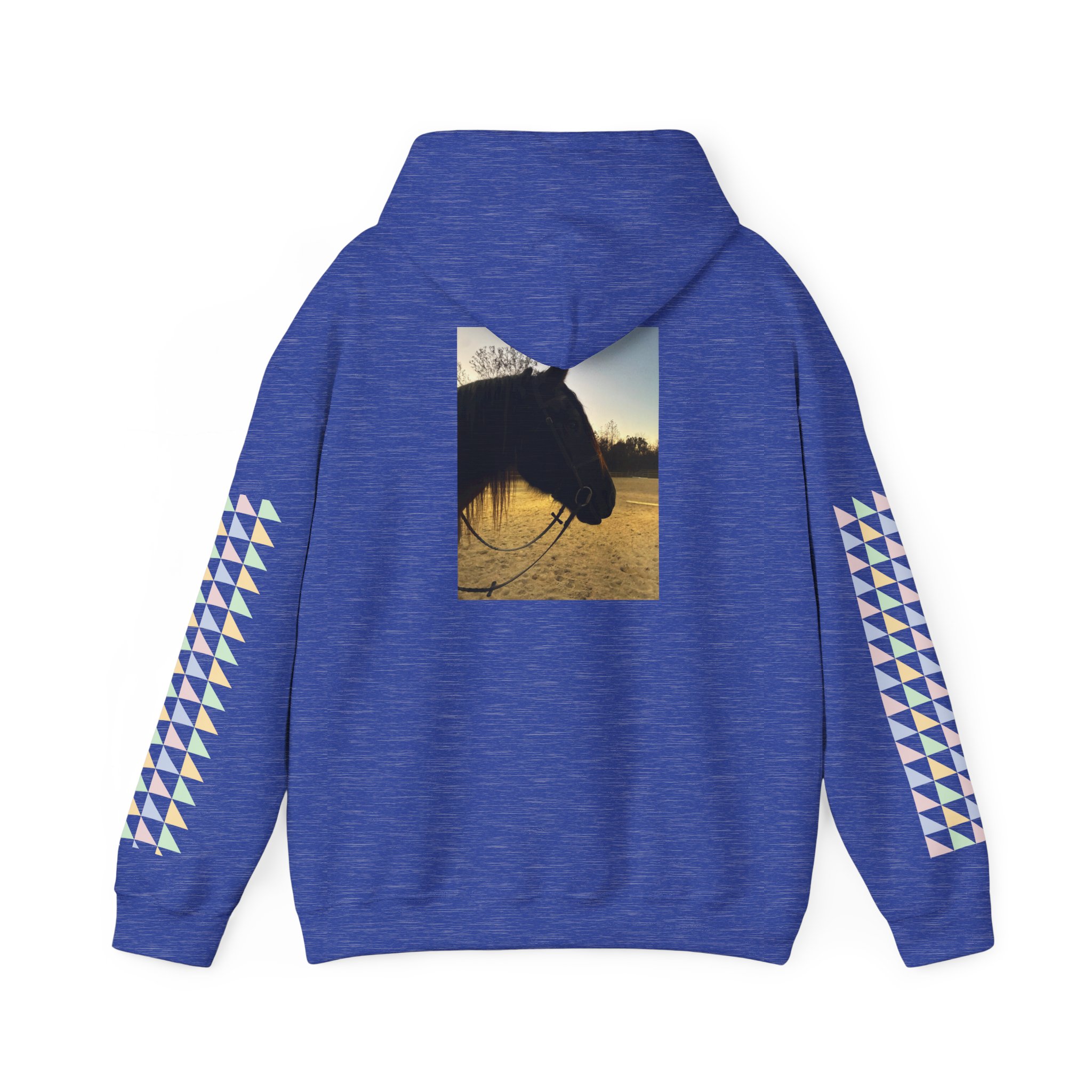 Soft, roomy hoodie that looks like a lived-in favorite from day one. A pale-pink heart and delicate brand name rest over the chest, while soft pastel triangle stripes run down both sleeves for a subtle, playful pop. On the back, a sunrise-silhouette horse photo adds quiet, nostalgic warmth—like the calm after a long ride. The double-lined hood and color-matched drawcord give structure; the kangaroo pocket keeps hands warm and practical items close. This piece drapes comfortably in a classic fit and feels substantial without being stiff—made for slow mornings, barn runs, and evenings by the fire.